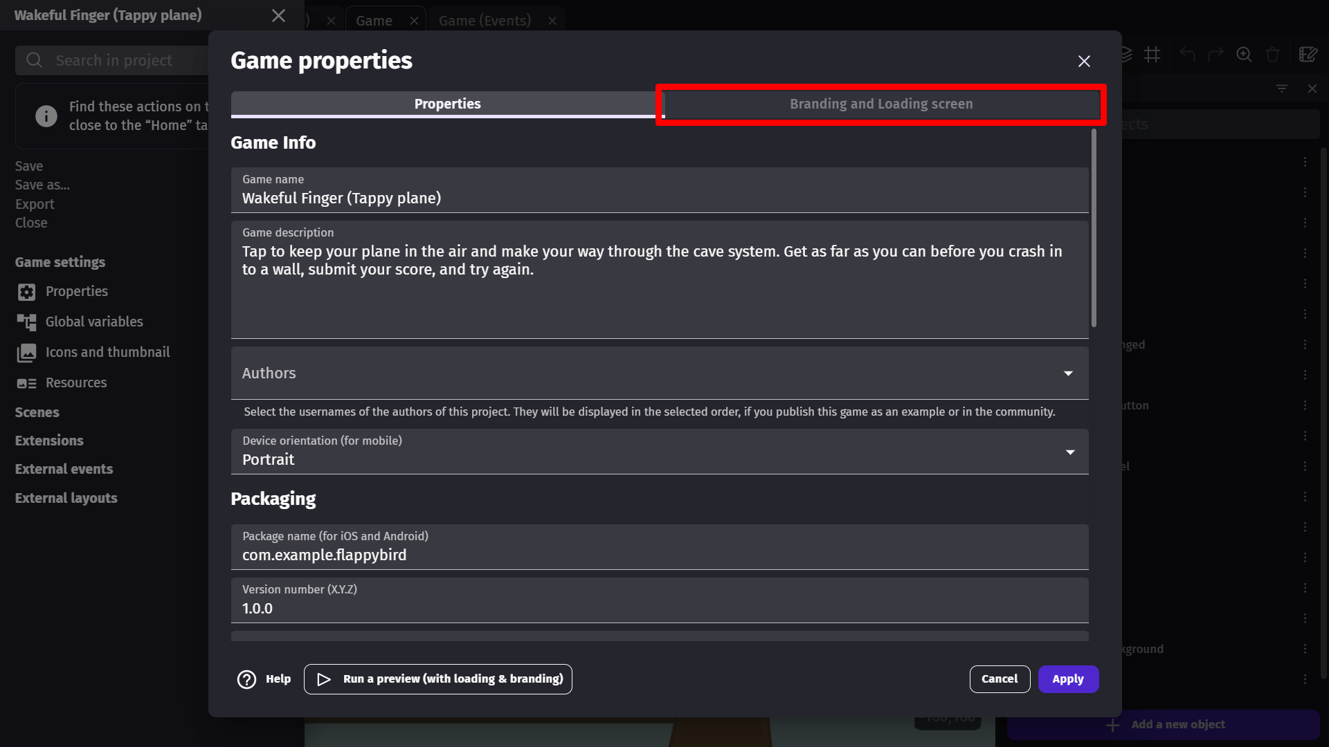 In the top right corner of the game properties window, you can select Branding and Loading Screen which will show you options for customizing the loading screen at the beginning of your game. From this tab you will be able to pick if your game has the GDevelop watermark, logo on startup, or both. As well as some other customization options.