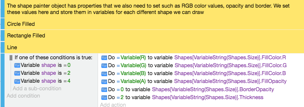 When you add an action to an event, select a Shape Painter object to display a list of shapes that can be drawn: