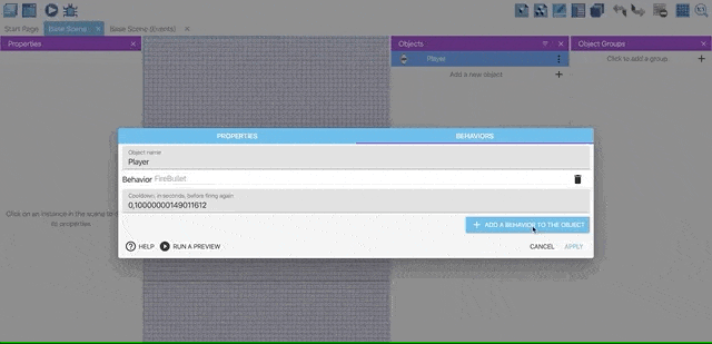 On the player's edit view, click on Add a new behavior to the object and search "fire" on Installed Behaviors. Then, select Fire Bullets. We'll now be able to fire bullets using an action that we'll add in the next steps.